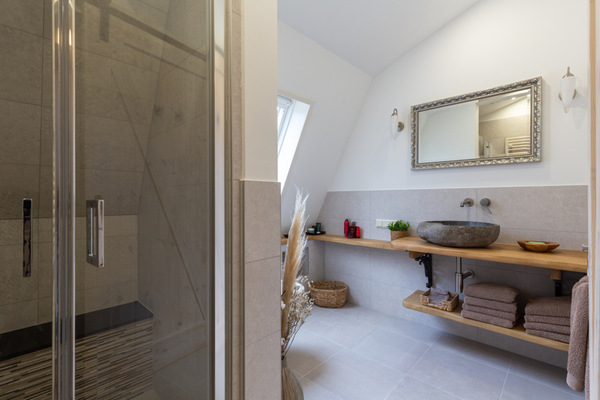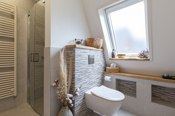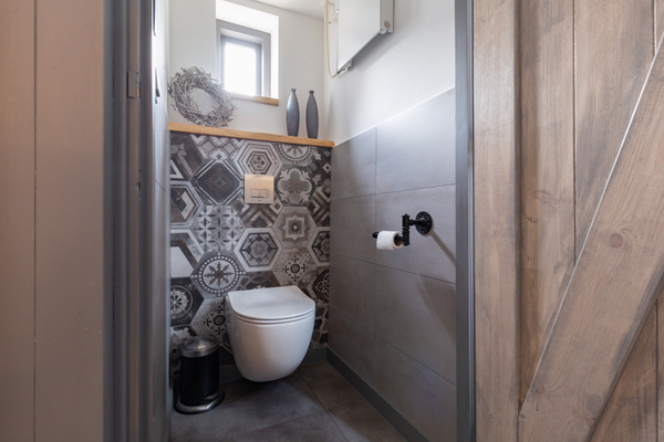 Ook de toiletruimte is weer up to date. In de badkamer hebben wij een uniek eiken wastafel meubel gemaakt, op maat die doorloopt onder het dakraam. In de nissen van de muren zijn contrast tegels verwerkt. Deze tegels komen terug op het inbouwreservoir van het toilet en in de doucheruimte.