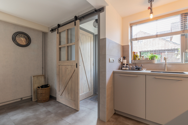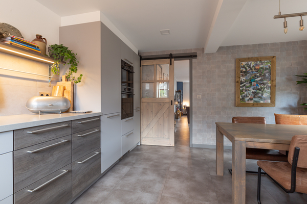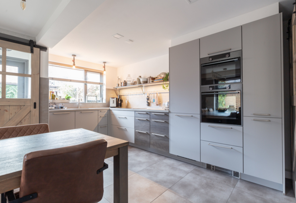 De gehele ruimte van de keuken is grondig aangepakt. Nieuw plafond, nieuwe vloer en natuurlijk een fijne keuken.