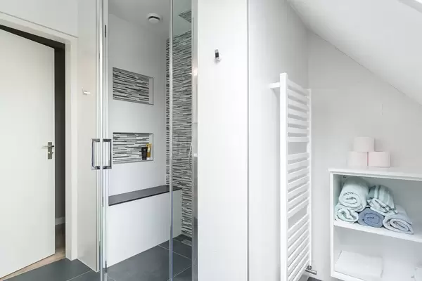 De klant waar we deze badkamer hebben mogen realiseren heeft gekozen voor luxe en comfortabele materialen. Zo is er een bankje tegenover de Sunshower gemaakt om optimaal te kunnen ontspannen. Door te gaan douchen op de tegelvloer is de instap zeer comfortabel en zeker voor de toekomst erg praktisch. Een leuke speelse touch zijn de rvs boxen in de wand, zo blijft het zitje vrij van spullen en ziet het er overzichtelijk uit in de douche. De witte wandtegels zorgen samen met het dakraam dat de ruimte heerlijk licht is en de nodige rust uitstraalt.