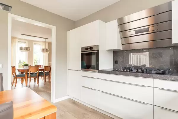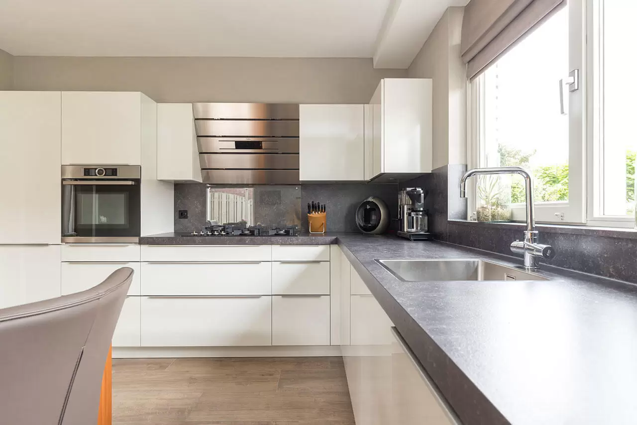 De nieuwe binnendeuren passen heel mooi bij de moderne uitstraling. De ronde klassieke toog naar de keuken heeft plaats gemaakt voor een strak exemplaar. Er is een frisse moderne keuken geplaatst met een prachtig werkblad. De nieuwe apparaten en de kokend waterkraan zorgen voor meer kookgemak. Wij hopen dat de familie jarenlang in dit prachtige huis met veel plezier mag wonen.