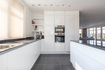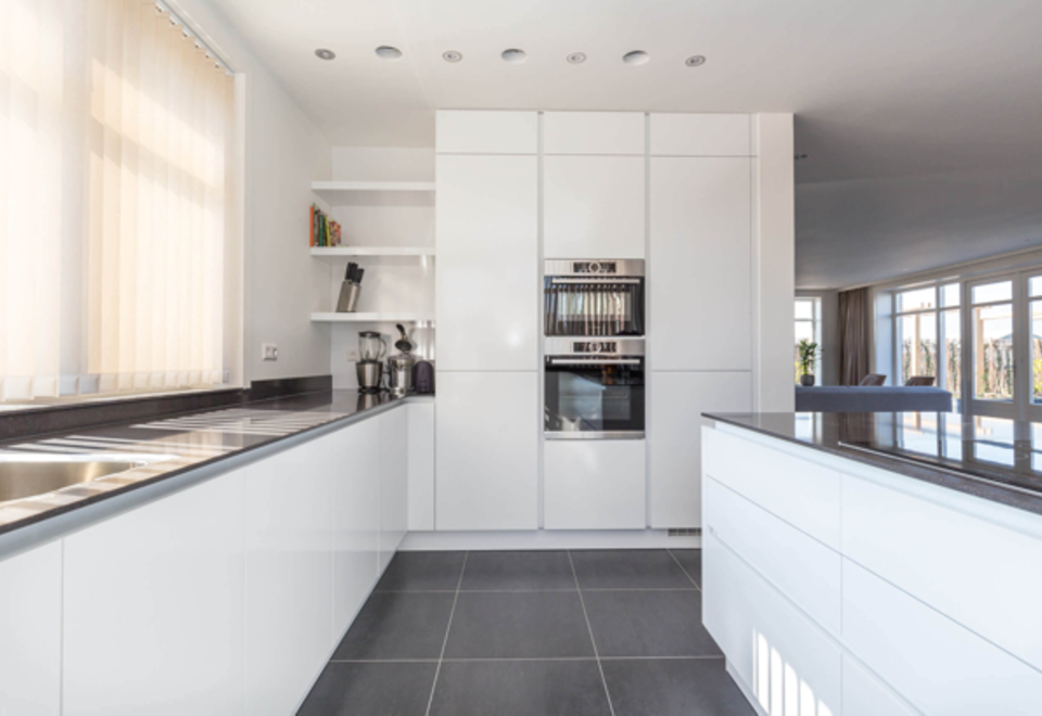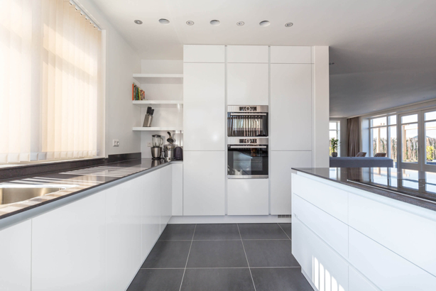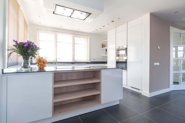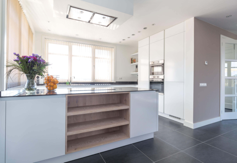 Het project Zuider Leidsevaart is een totaal project geworden. Wij hebben de badkamer en keuken mogen leveren en plaatsen voor een nieuwbouw woning. In deze witte greep loze keuken is veel kastruimte gecreëerd, de meubelmaker heeft in het “eiland” nog een kast gemaakt waar je leuke accessoires in kan zetten. De afzuiging is via een plafondunit zodat je vrij zicht hebt tijdens het koken.