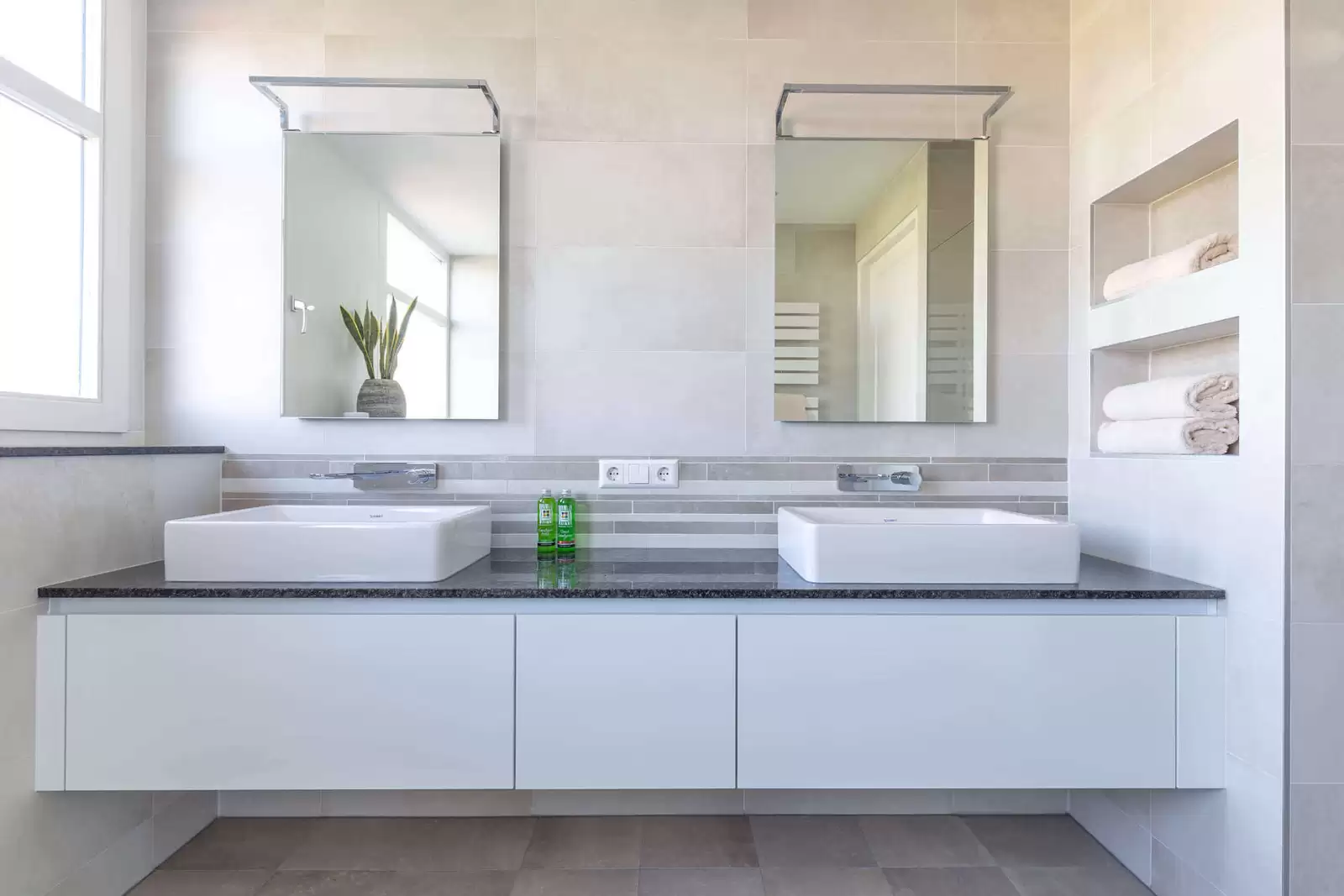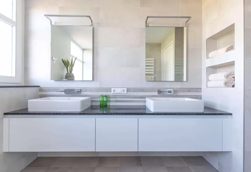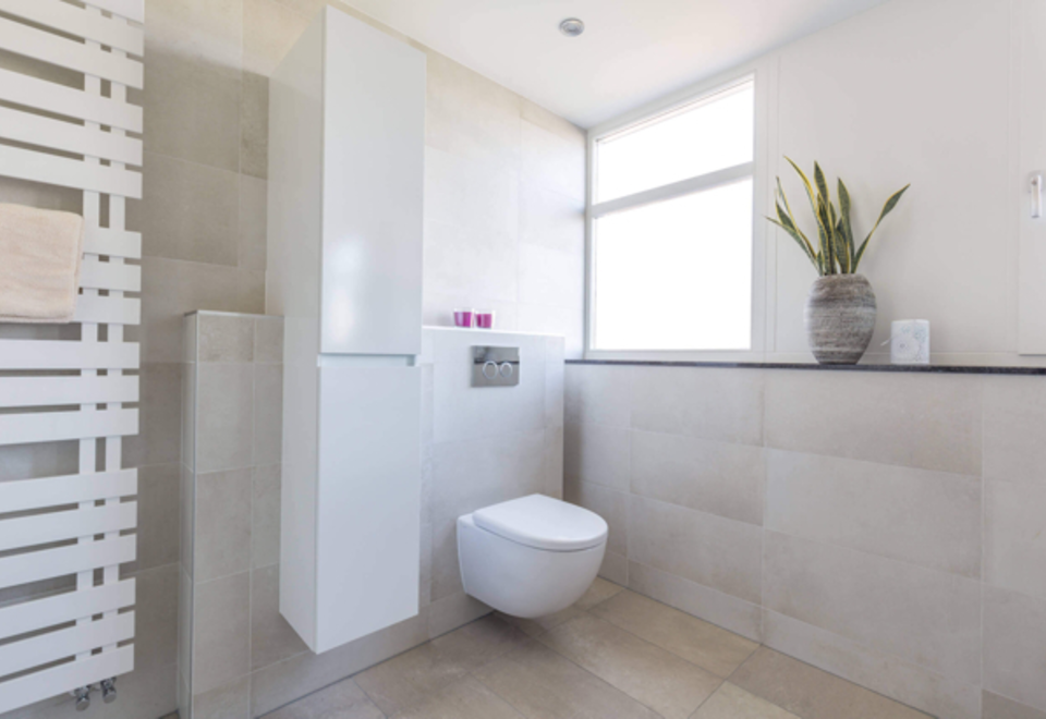 De badkamer is betegeld met een rustige sfeervolle tegel. Er is gekozen voor een prachtig meubel met waskommen en kranen die uit de muur komen. In het douchegedeelte hebben we een bankje gemaakt met hetzelfde materiaal als o.a. het wastafelblad, hier kun je uiteraard op zitten maar ook de shampoo opzetten.